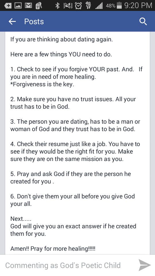 ONLINE MAGAZINEAnswers To Dating Again! February 25, 2015 secretangel Love this… GOD'S POETIC CHILD!!! Something that everyone needs to read. This is my page on facebook page by the way. View original postShare this: Click to share on X (Opens in new window) X Click to share on Facebook (Opens in new window) Facebook Like Loading... Published by secretangel View all posts by secretangel